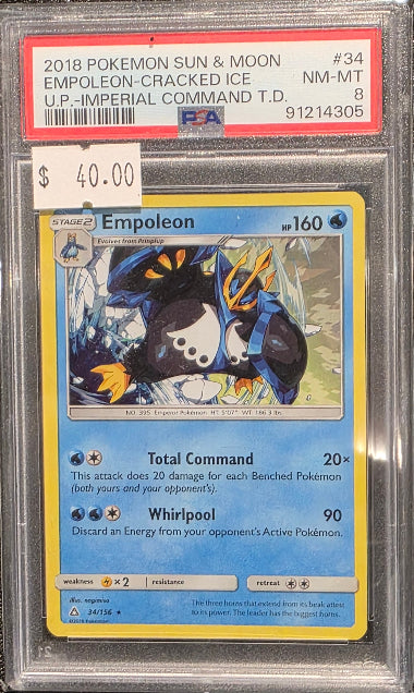 PSA 8- EMPOLEON #34- CRACKED ICE HOLO - 2018 POKEMON SUN & MOON - ULTRA PRISM- GRADED CARD