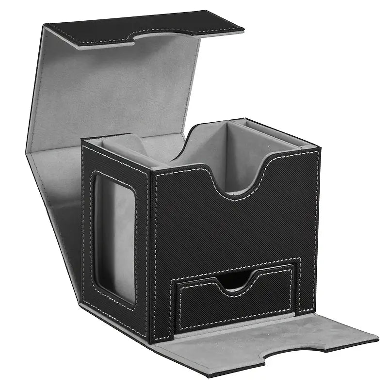 Trading Card Deck Storage Case PU Leather Deck Box - Accessories Drawer Black Grey Lining