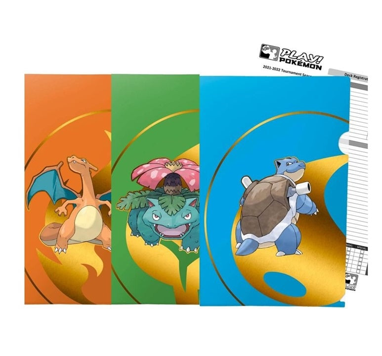 Organize and store your deck lists, tournament notes, and more in Tournament Folios for Pokemon! Each folio features a vibrant full-art cover of iconic Pokémon such as Charizard, Blastoise, and Venusaur. The thumb notch cut-out makes it easy to slide your deck list in and out. 3-Pack comes with one of each Pokémon character cover art. Sized to fit deck lists up to size A4. Measures approximately 8.6” x 12.2”.